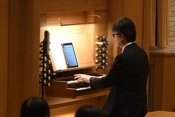 大チャペルの他、小チャペル・カフェテリアに、式場の映像を流し、こちらも多くの保護者の方々に参加いただきました。