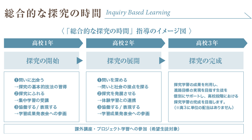 本校では探究学習の実施・推進を通じて生徒の進路目標の実現を支援するに留まらず、進学・就職後もそれぞれの場所でいきいきと活躍することのできるひと、生涯にわたって学ぶことに前向きな、学び続けることのできるひと、知的な営みに対する信頼を持ち、他者と共に他者のために力を尽くすことのできるひとを育てることを目指しています。