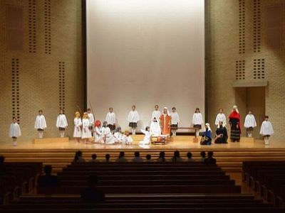 12月19日(金)10:30~11:30、大チャペルにて小学生・中学生が参加しての“クリスマスページェント”(イエス・キリスト降誕劇)の礼拝が守られました。高校生がナレーターを務め、その聖書朗読に合わせて降誕劇が繰り広げられました。また、中学聖歌隊の歌声、また、ハンドベル・クワイアの奉鐘がチャペル全体に満ち、2階席の保護者の方々、教職員も共に讃美歌を歌い、クリスマスの喜びを分かちあいました。