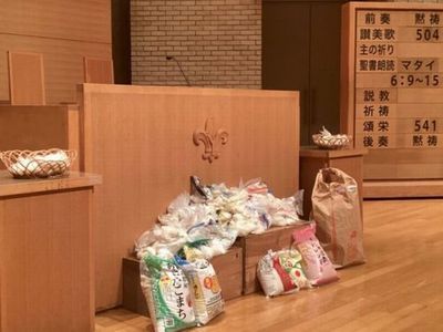 礼拝に合わせて、中学では果物の持ち寄りを、高校では一人一合程度のお米の持ち寄りを呼びかけました。果物は、学外、学内でお世話になっている所や関わりの深い関係施設等へお届けしました。