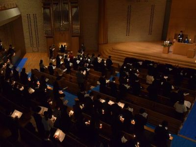 12月10日(水)16:00~16:50、大チャペルにて燭火礼拝(しょっかれいはい、キャンドルサービス)が持たれました。キリスト教青年会やその枝会(キリスト教青年会OB)が準備を行い、司式、奏楽、点火係を中高生が担当し、礼拝説教は高校宗教主任、そしてハンドベル・クワイアの奉鐘「O Come All Ye Faithful」(讃美歌・神の御子は今宵[こよい]しも)が礼拝中にありました。オール横須賀学院の行事として、小学校児童・中高生徒の皆さん、保護者の皆様、卒業生の方々、教職員など横須賀学院に連なる多くの人達が共にクリスマスを祝う礼拝を持ちました。一人一人が手元のキャンドルに点火し、その灯りに照らされた礼拝は、クリスマスの喜びをお祝いする大切なひと時となりました。