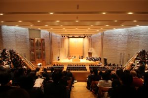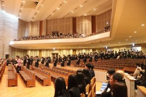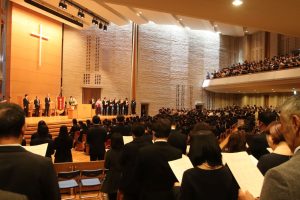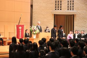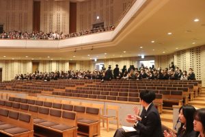 満席となった会場に、担任に引率された卒業生が入場。伝統の10点鐘と開会宣言によって厳かに式はスタートしました。大チャペルの映像を小チャペルやカフェテリアにも中継し、またYouTubeでも式の様子を配信しました。讃美歌4番、聖書朗読(ルカによる福音書10章25~37節)、祈祷に続き、卒業生全員に一人ずつ手渡される卒業証書授与、